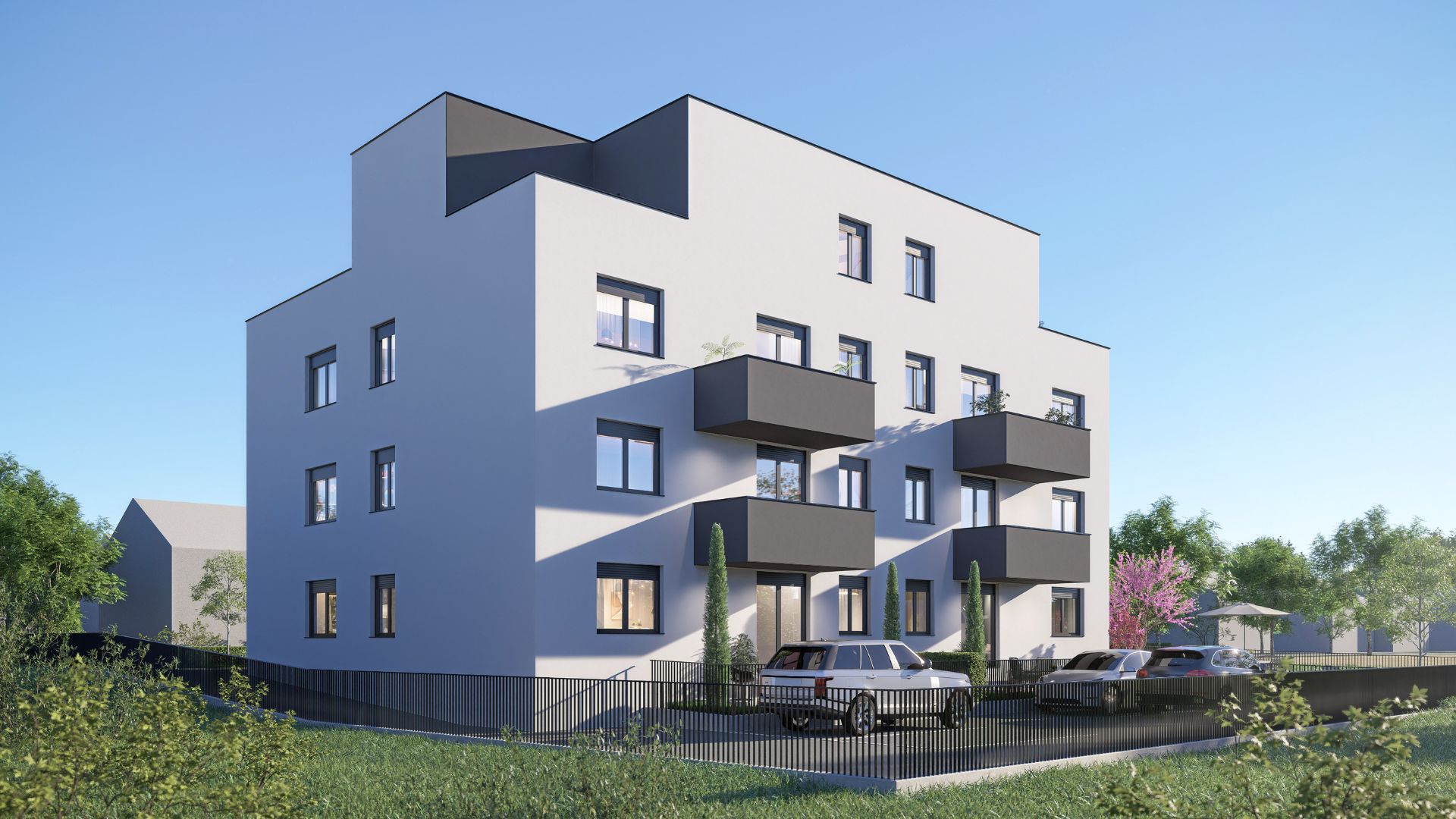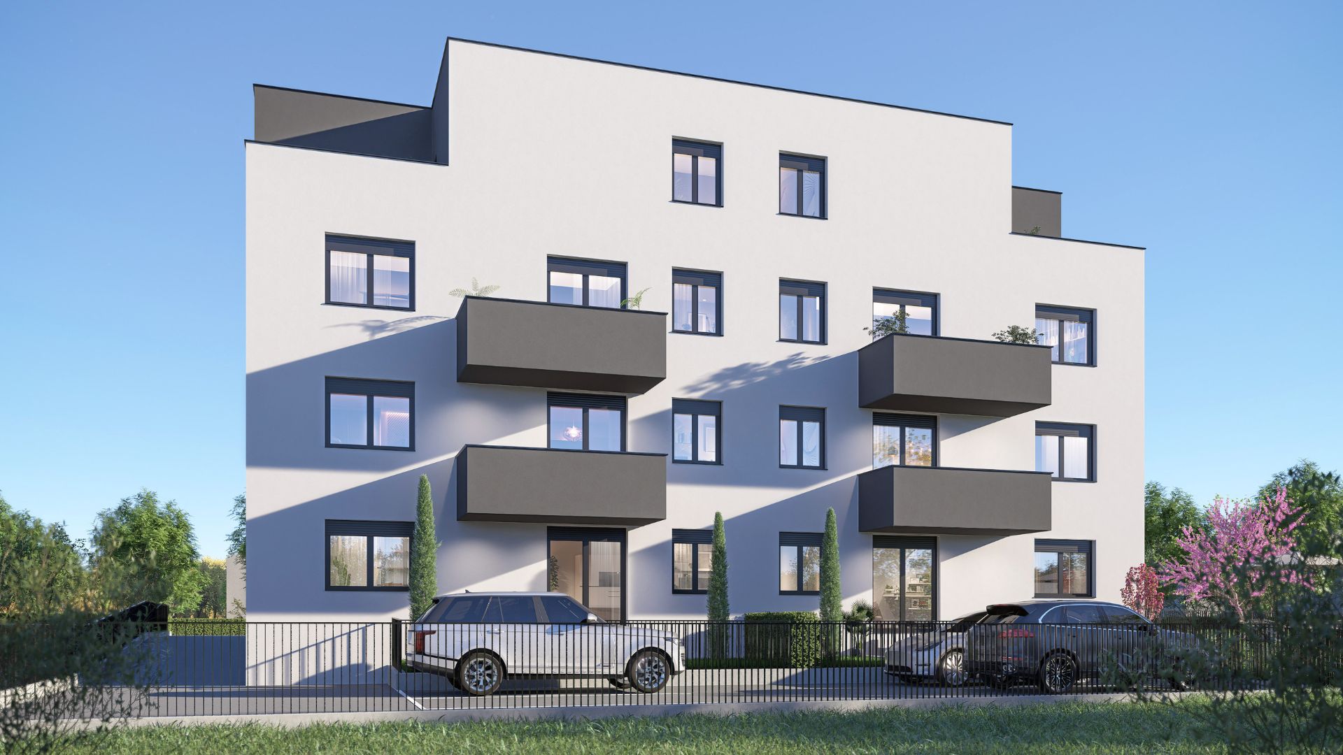 Zgrada se sastoje od: GARAŽE + 4 NADZEMNE ETAŽE – Podrum, Prizemlje + 3 kata – ukupno 14 stanova.